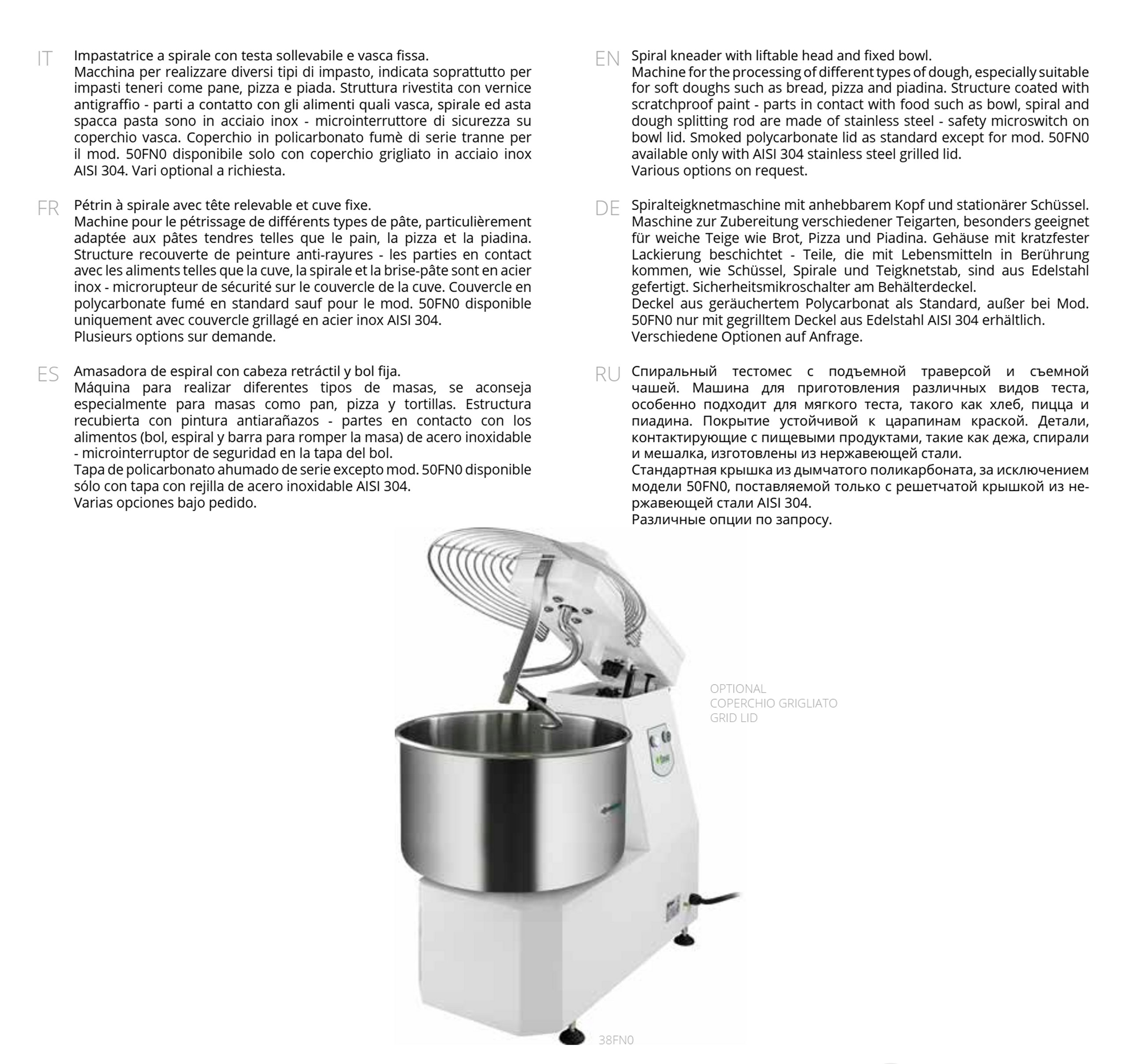 - parti a contatto con gli alimenti quali vasca, spirale ed asta spacca pasta sono in acciaio inox AISI 304