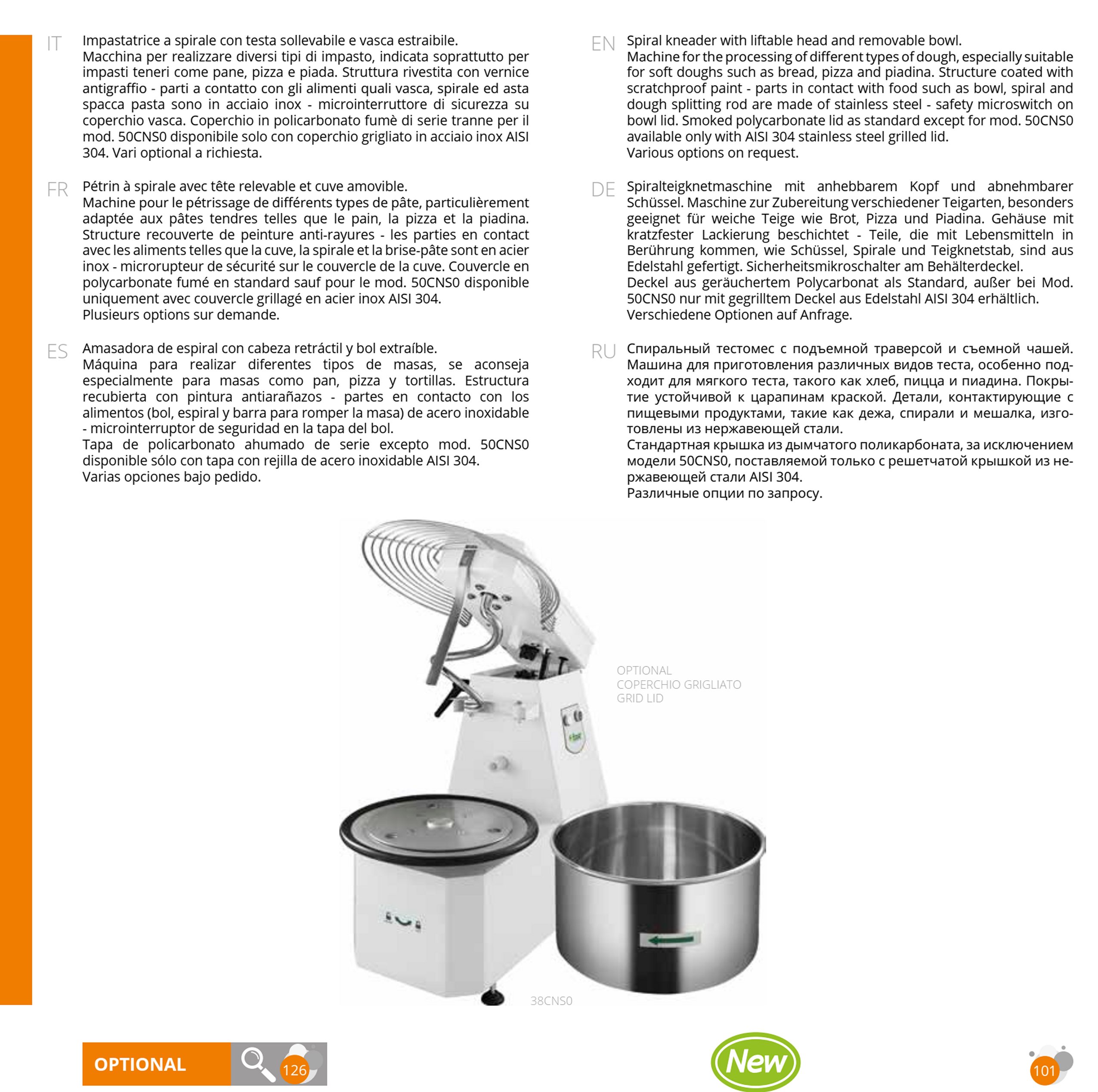 - parti a contatto con gli alimenti quali vasca, spirale ed asta spacca pasta sono in acciaio inox AISI 304
