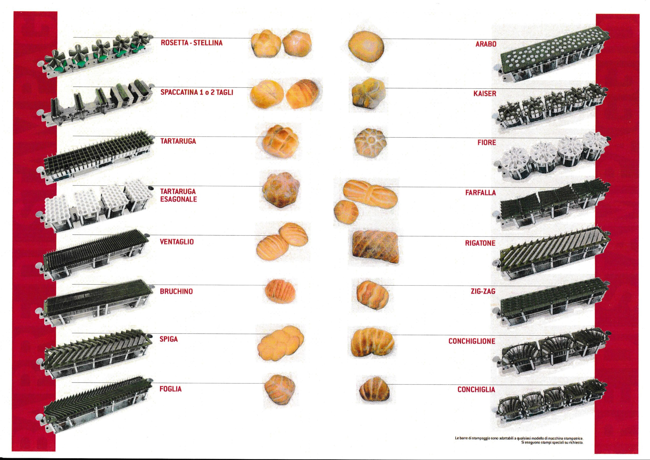 Questa macchina stampa automaticamente diversi tipi di pane in base al tipo di stampi prescelti (panini, spaccatine, rosette, maggiolini, ecc.).