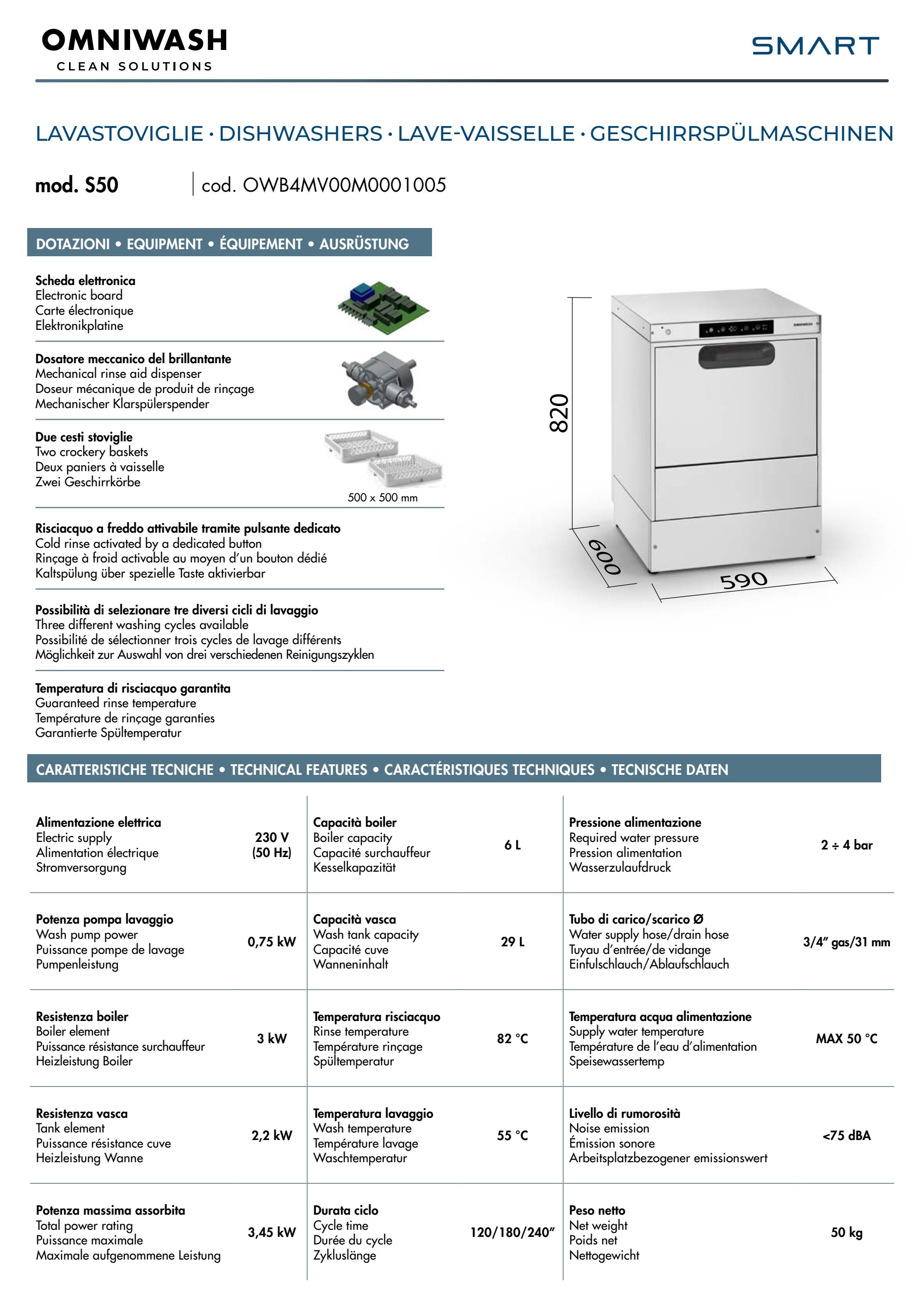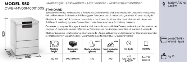 Serie: Smart Model S50 Le apparecchiature della Linea Smart rispondono perfettamente ad Scheda elettronica Risciacquo a freddo attivabile tramite pulsante dedicato Dosatore meccanico del brillantante Possibilità di selezionare tre diversi cicli di lavaggio Temperatura di risciacquo garantita Due cesti stoviglie |